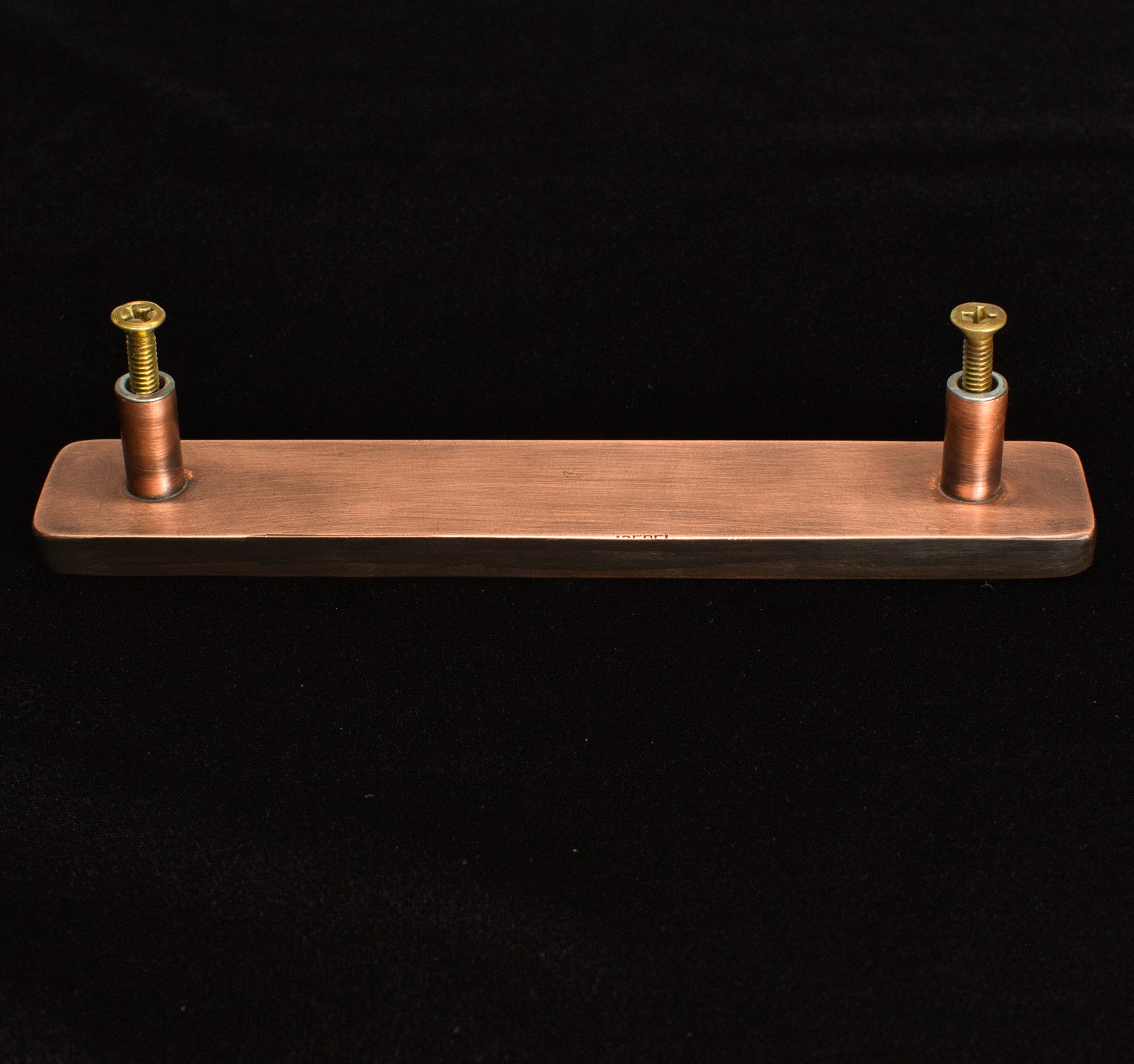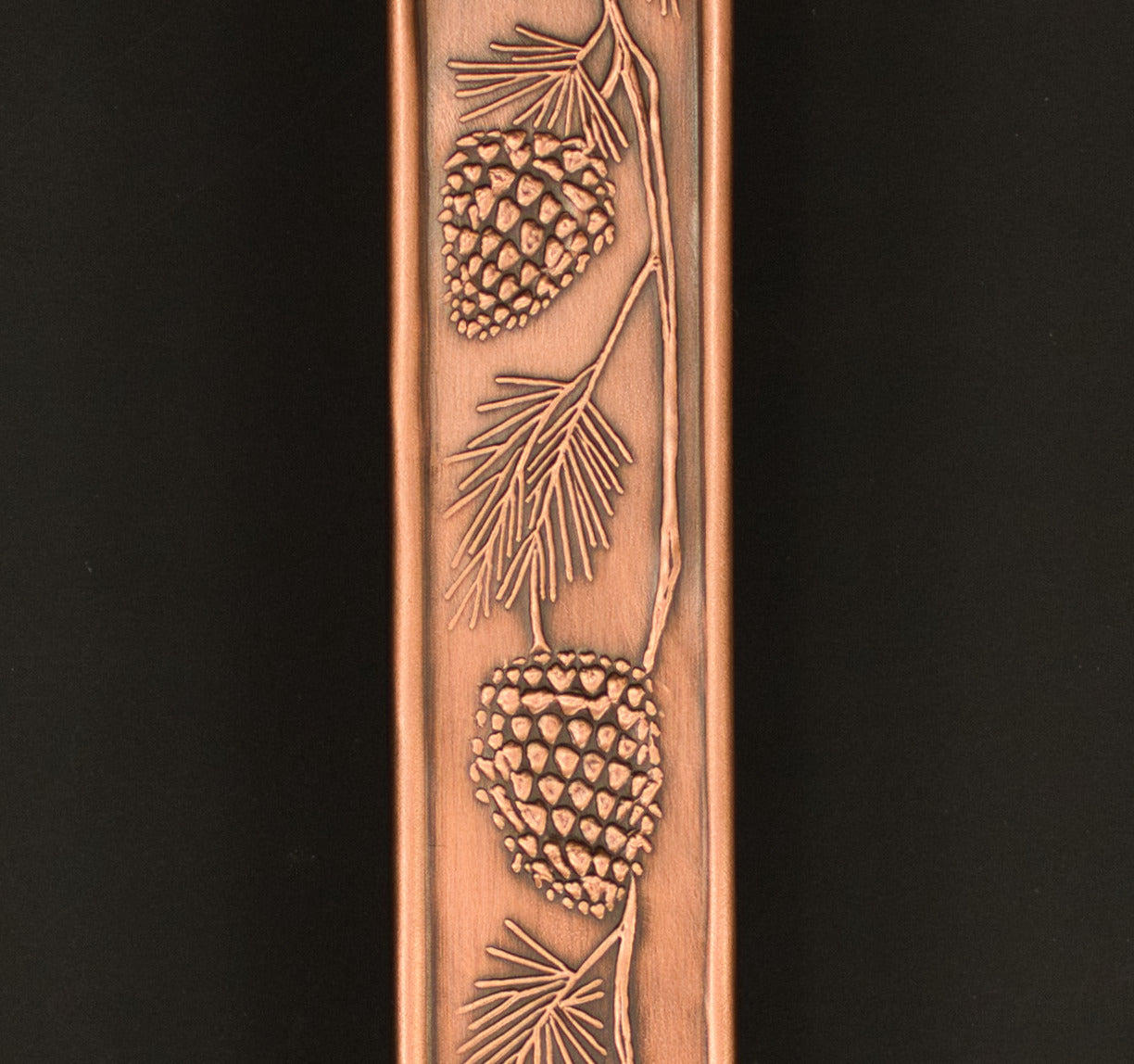 This design can be installed vertically or horizontally. These pulls are skillfully crafted using heavier solid copper plate and components making them quite unique. Each design is carefully hand carved into a die. The pulls are finished with a hand rubbed patina and a high-quality sealer, truly jewelry for your home!
