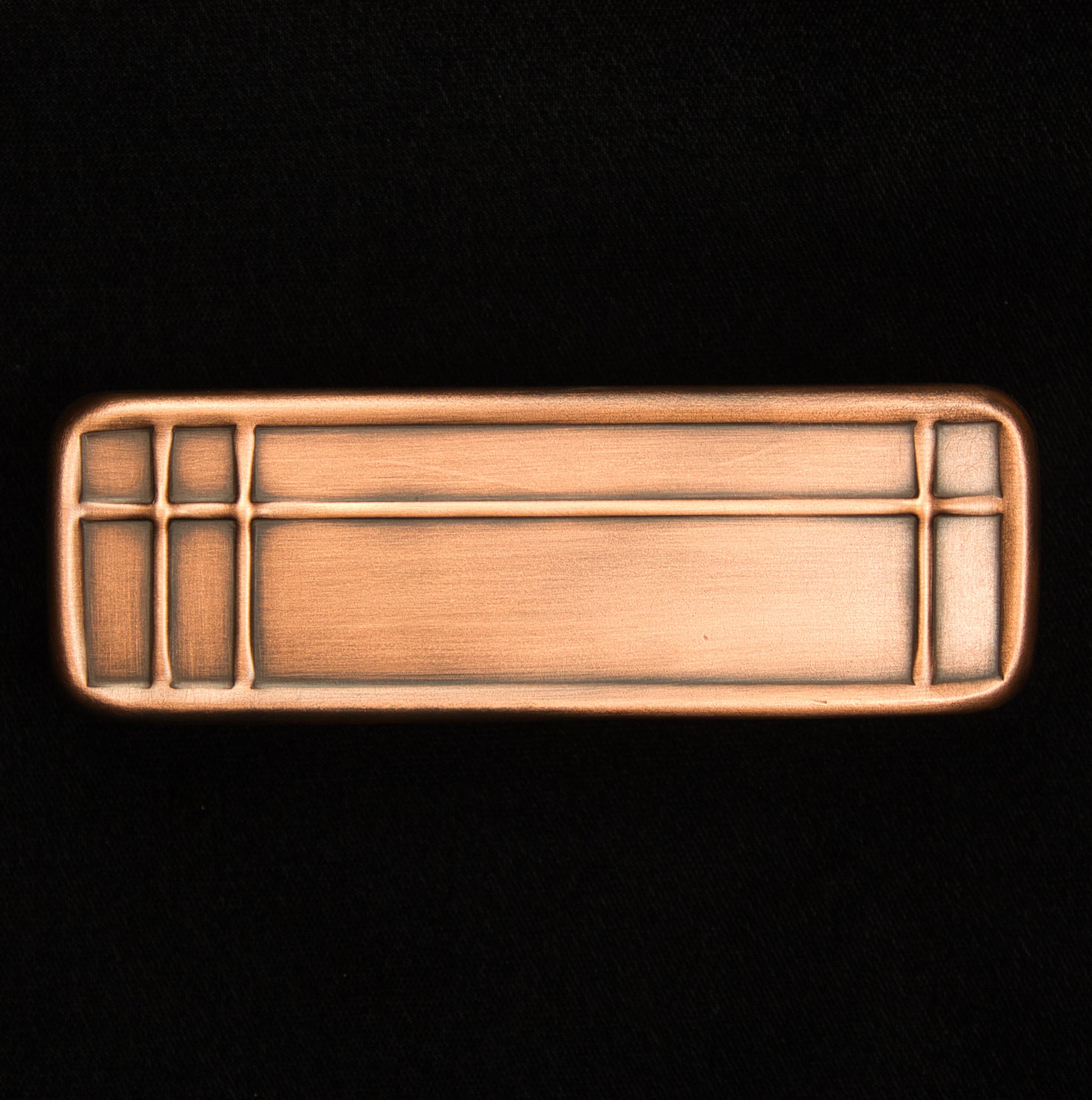 Elegant in its' geometric simplicity, this prairie design copper drawer pull was inspired by the work of Frank Lloyd Wright. Mounts are 3" center to center. Brass screws included.