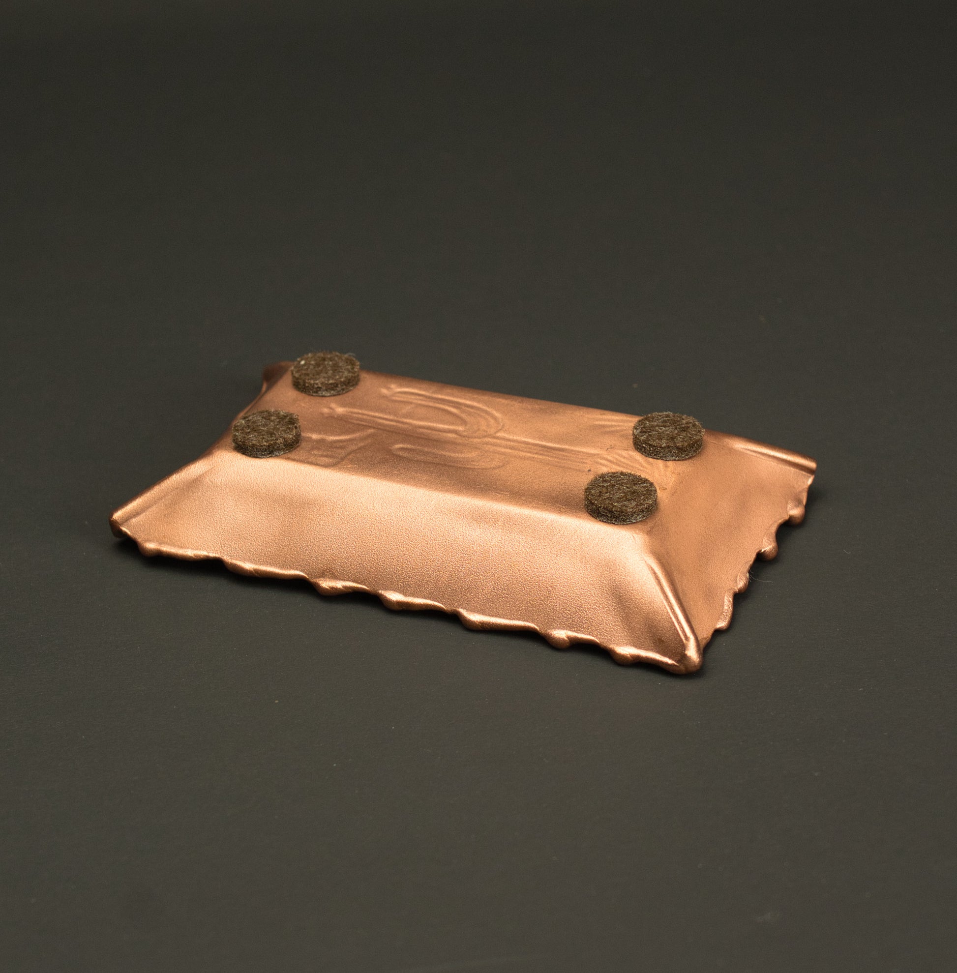 This versatile little tray can be used for rings or as a general catchall with a depth of 1/2". Handmade from 100% copper with a droplet edge makes each one unique. There are small pads on the back to protect your furniture. What a lovely, unique gift!