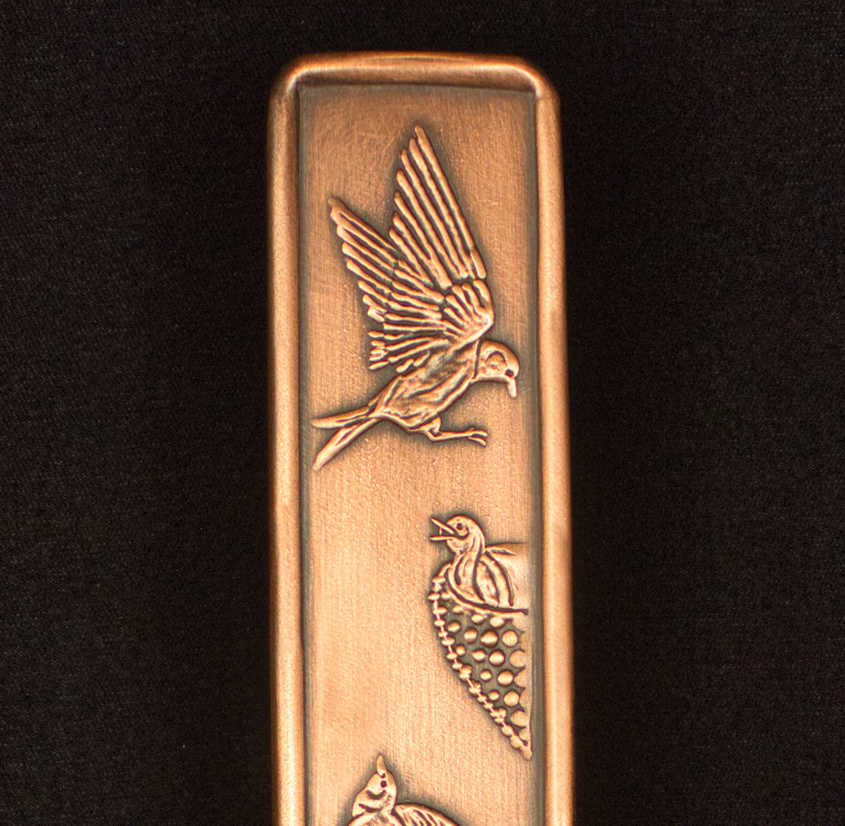 These pulls are skillfully crafted using heavier solid copper plate and components making them quite unique. Each design is carefully hand carved into a die. The pulls are finished with a hand rubbed patina and high-quality sealer, truly jewelry for your home!